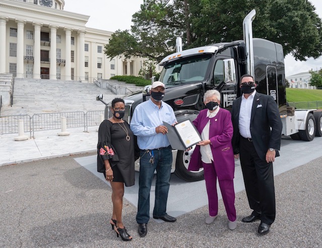 Photo: Montgomery Transport driver Rosko Craig is presented a commendation from Alabama Gov. Kay Ivey in recognition of his service and National Truck Driver Appreciation Week. (Photo by Governor's Office/Hal Yeager courtesy of Alabama Trucking Association)