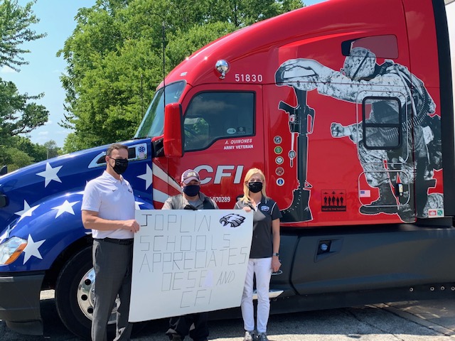 Photo: Joplin, Mo., School District officials express their appreciation to CFI Logistics and driver Angel Quinones for delivering a load of face masks in time for the start of the school year. (Photo by Joplin School District courtesy of CFI).